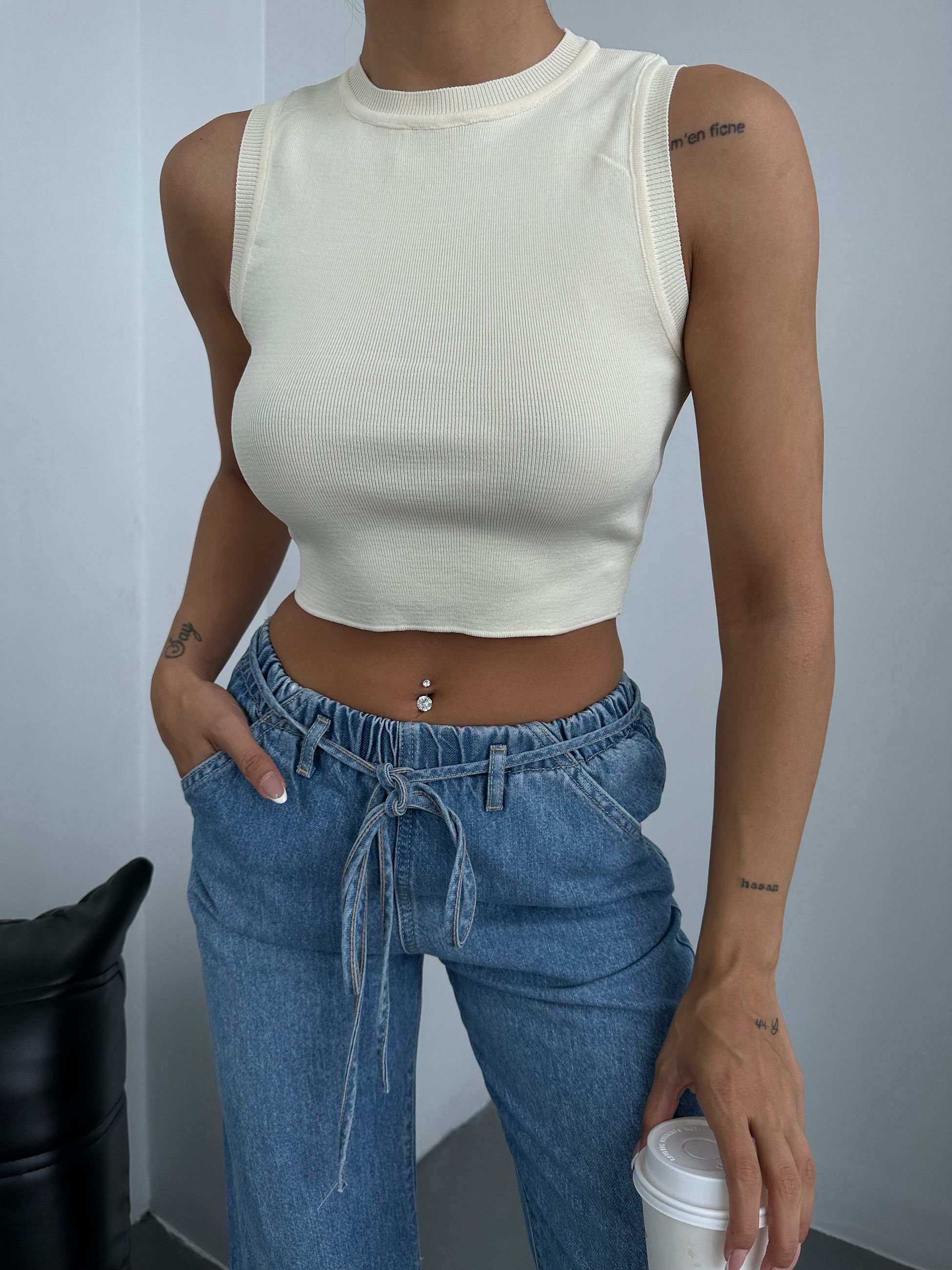 Bisiklet Yaka Düz Renk Crop Triko Bluz