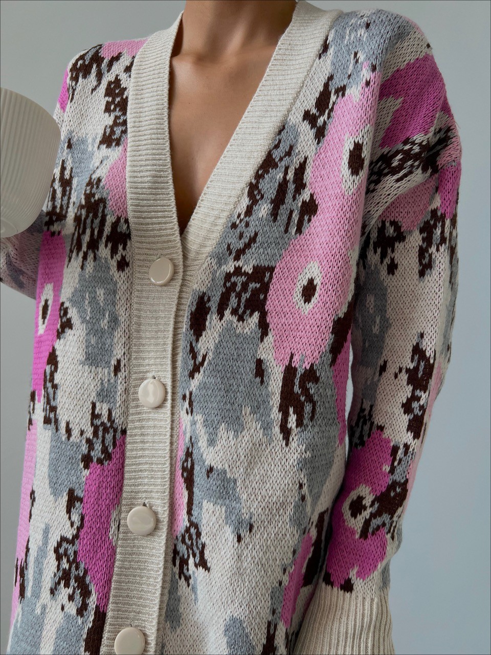 Çok Renkli Çiçek Desen Oversize Triko Hırka
