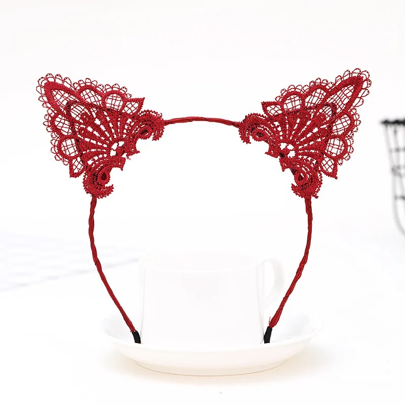 Dantelli Kırmızı Kedi Tacı - Vintage Tarz Dantel Kedi Kulak