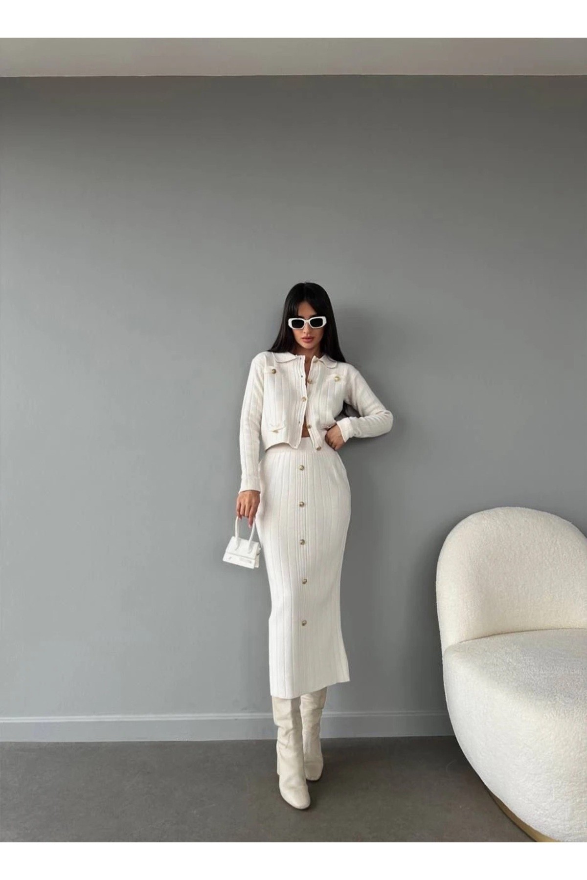 Hırka Etek Düğme Detaylı Alt-üst Triko Takım