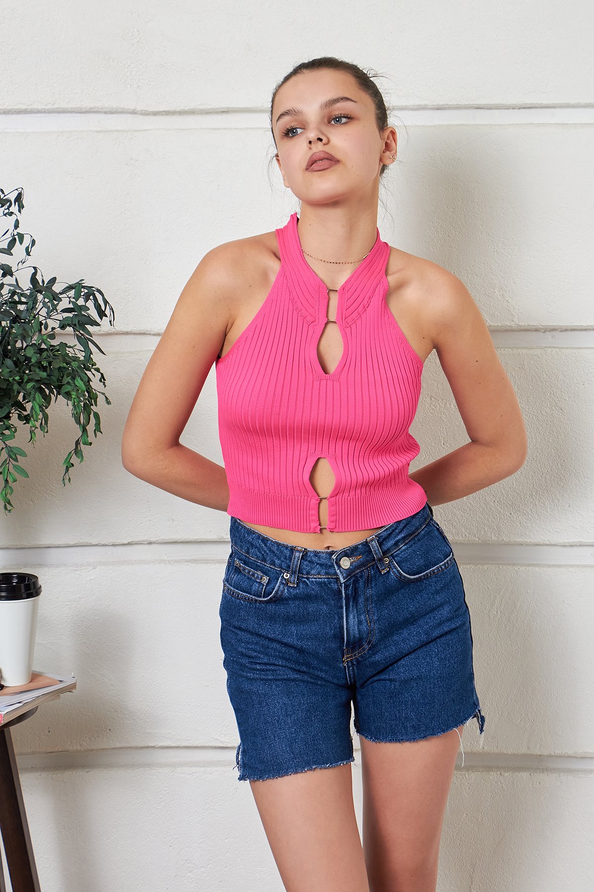 Kadın Aksesuarlı Crop Triko Bluz