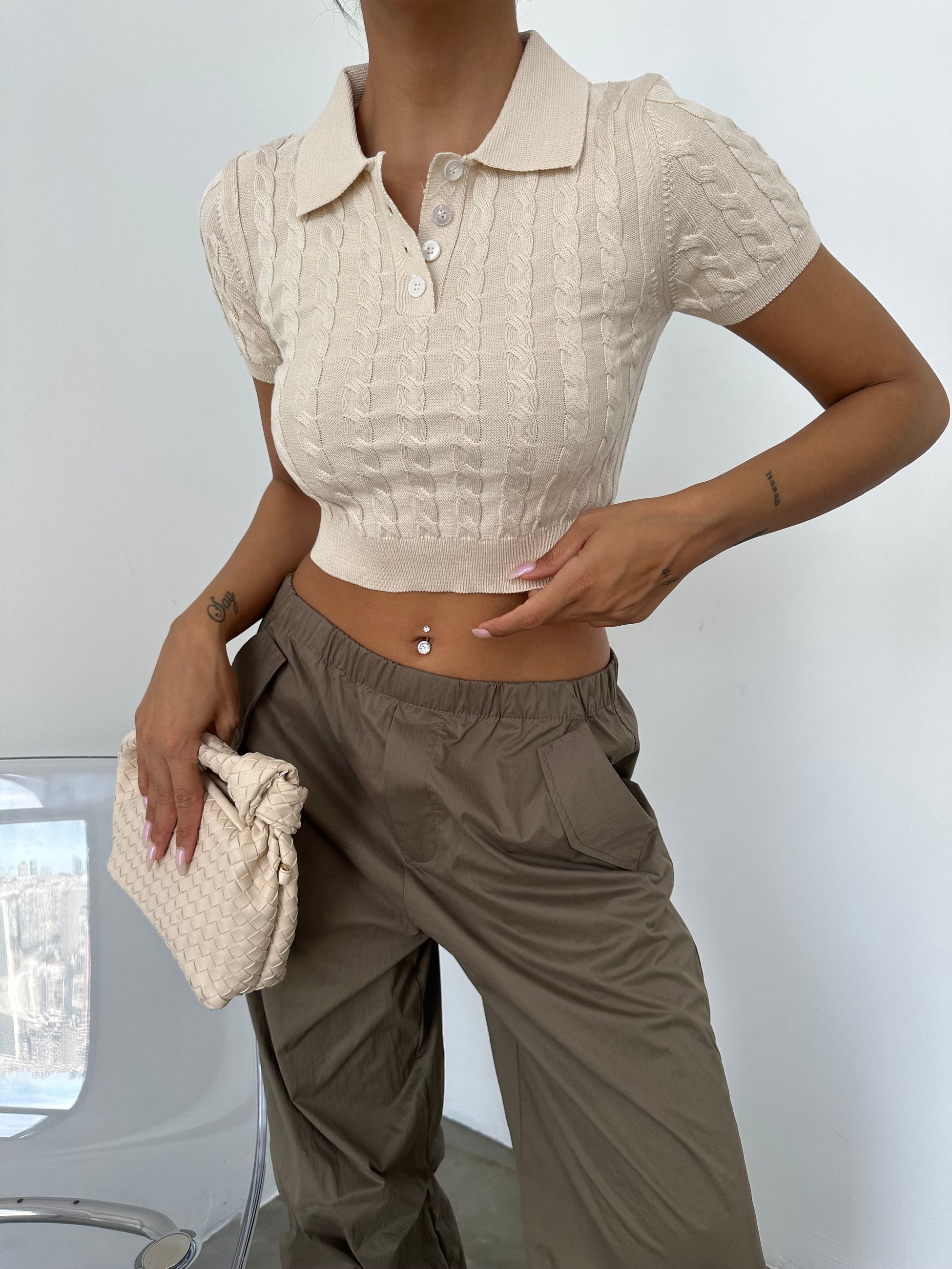Kadın Bej Polo Yaka Saç Örgü Crop Triko Tişört