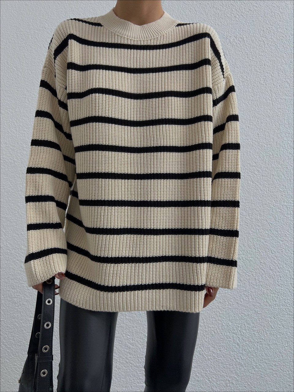 Kadın Çizgili Bisiklet Yaka Oversize Triko Kazak