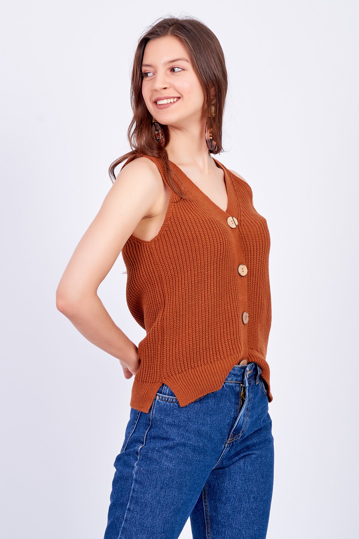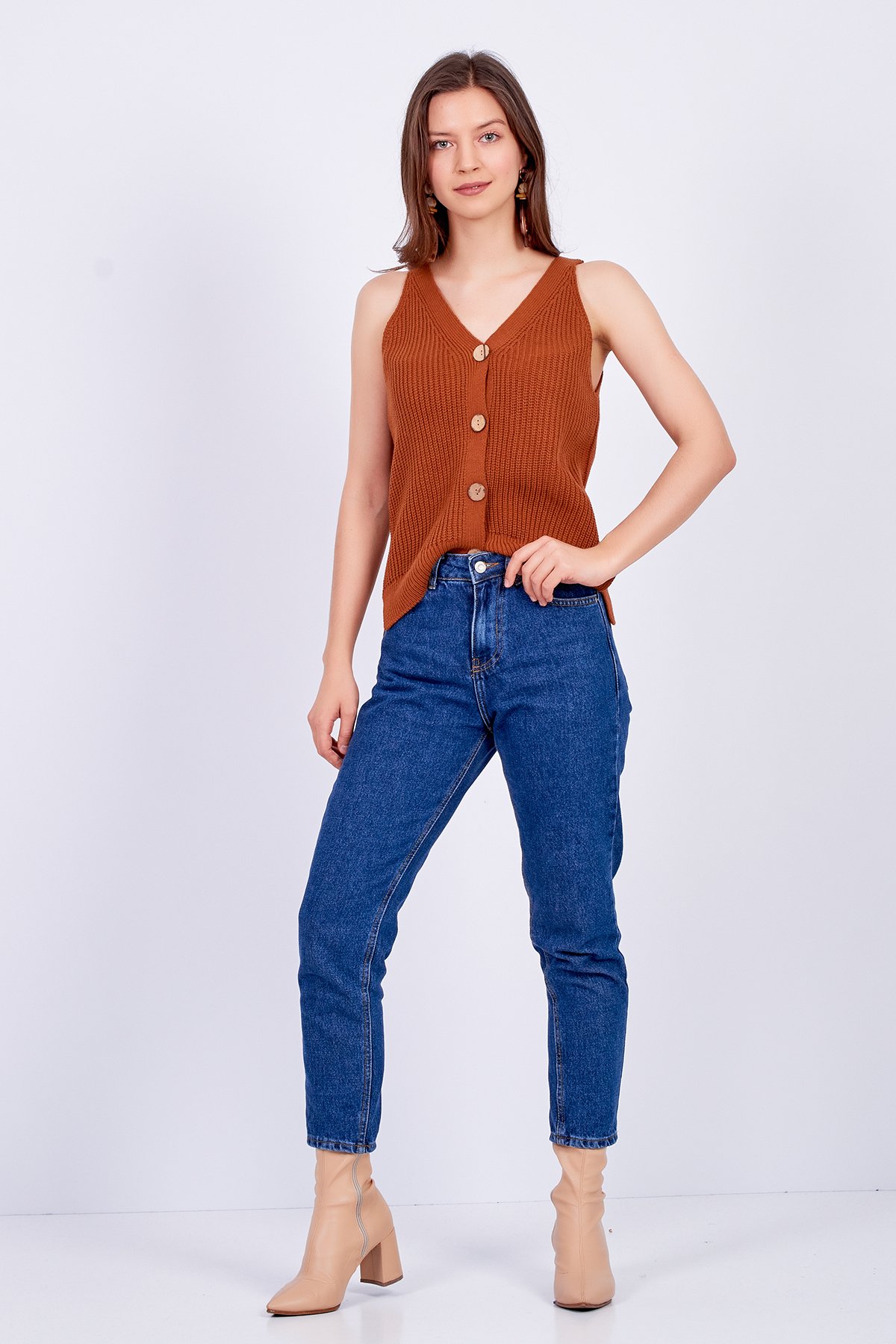 Kadın Düğmeli Askılı Crop Triko Bluz