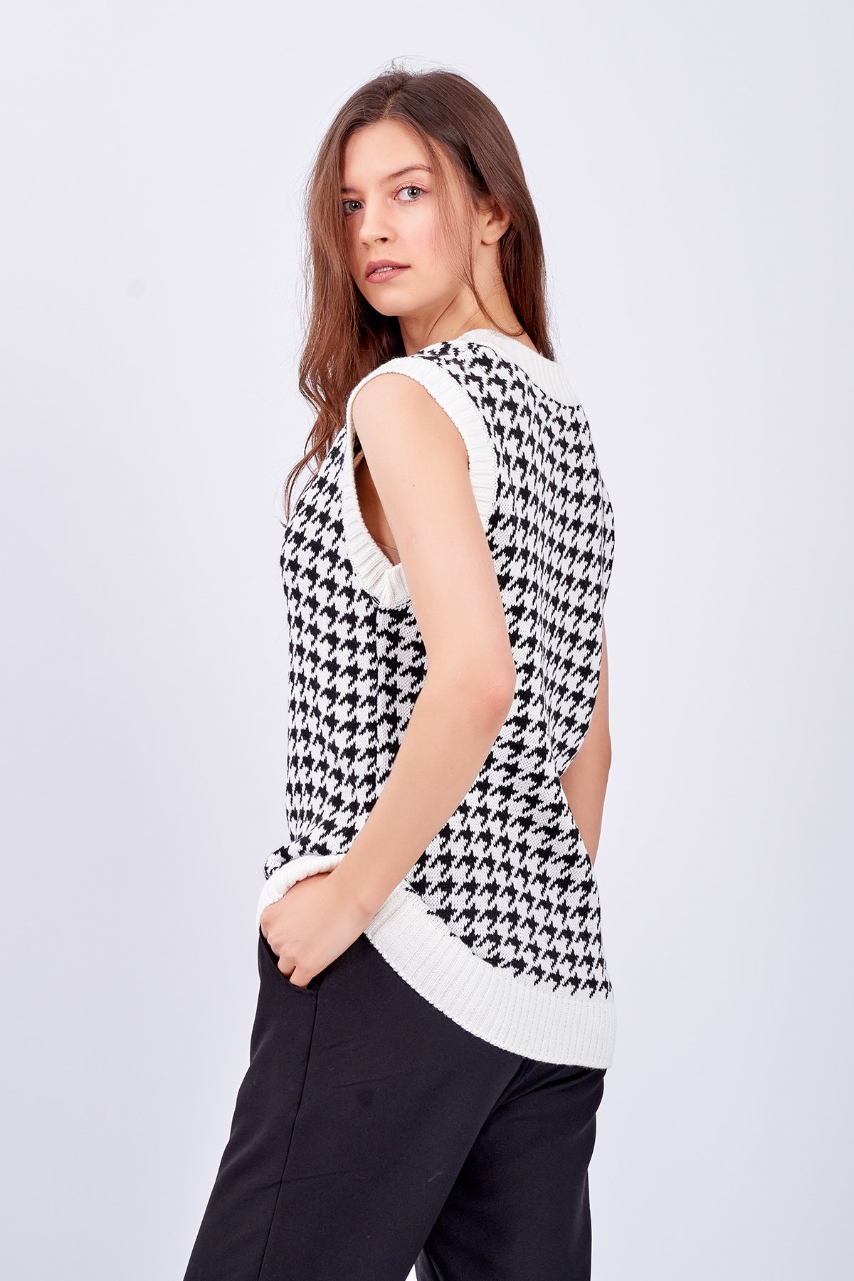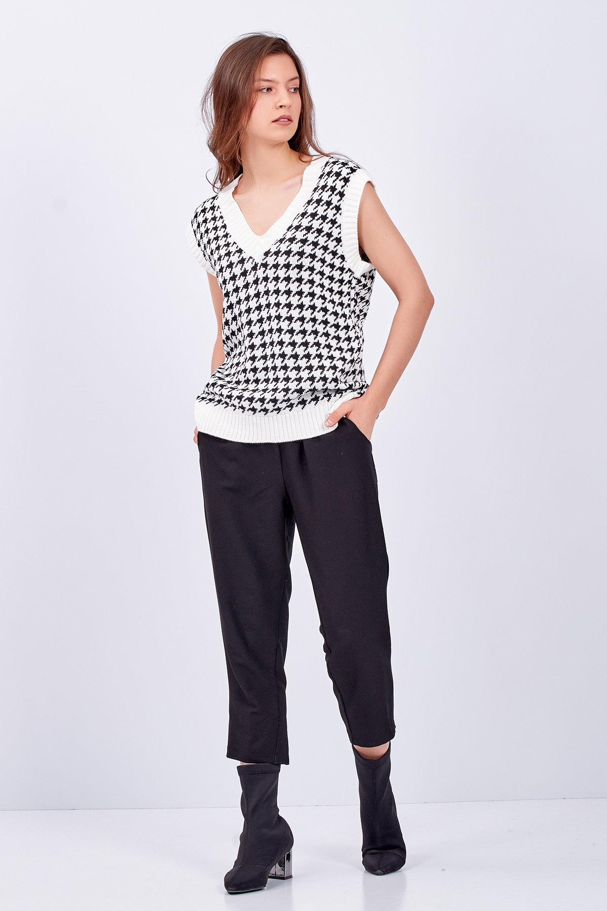 Kadın Kaz Ayağı Desenli V Yaka Oversize Triko Süveter