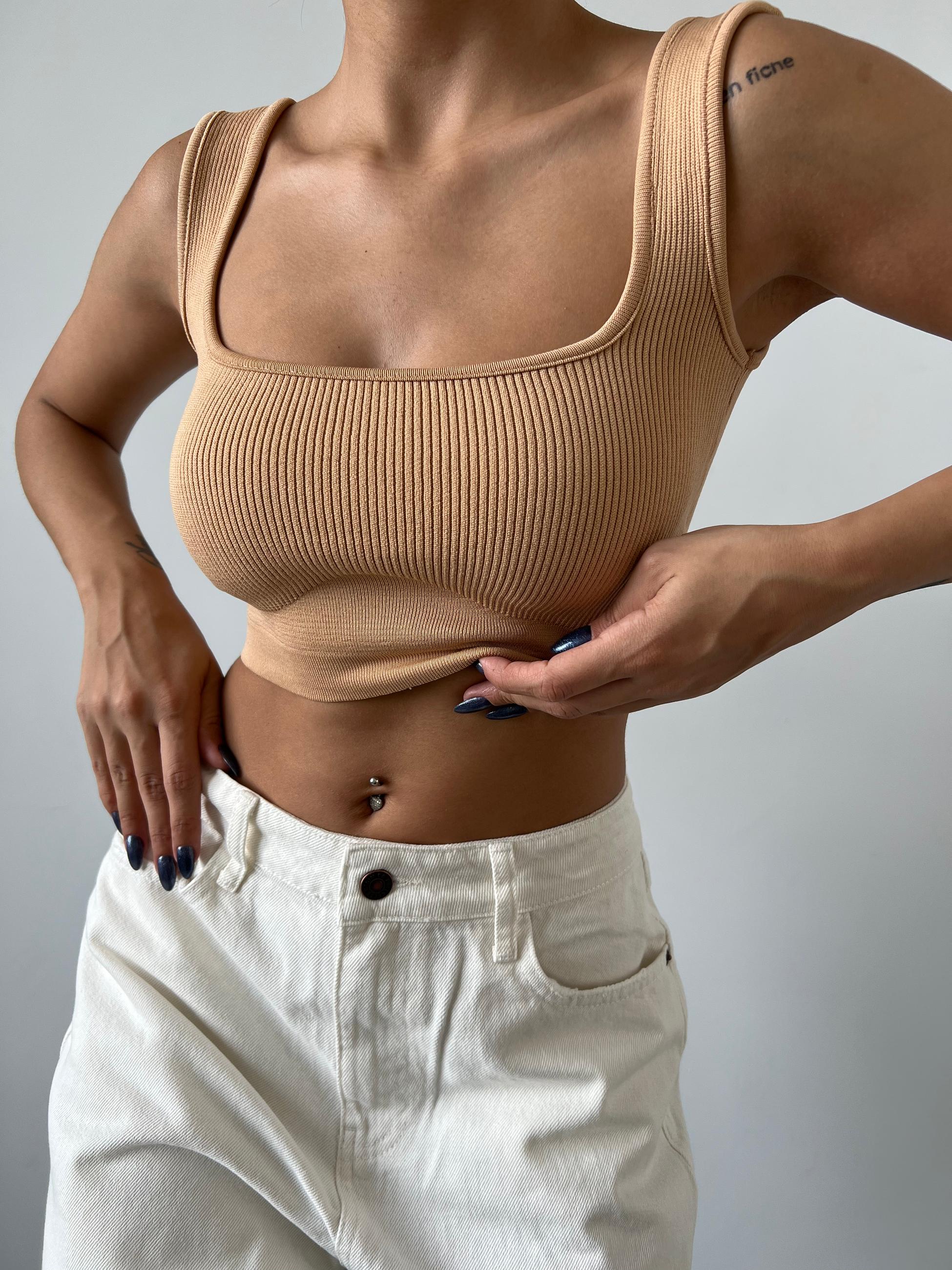 Kare Yaka Spor Kesim Crop Triko Bluz