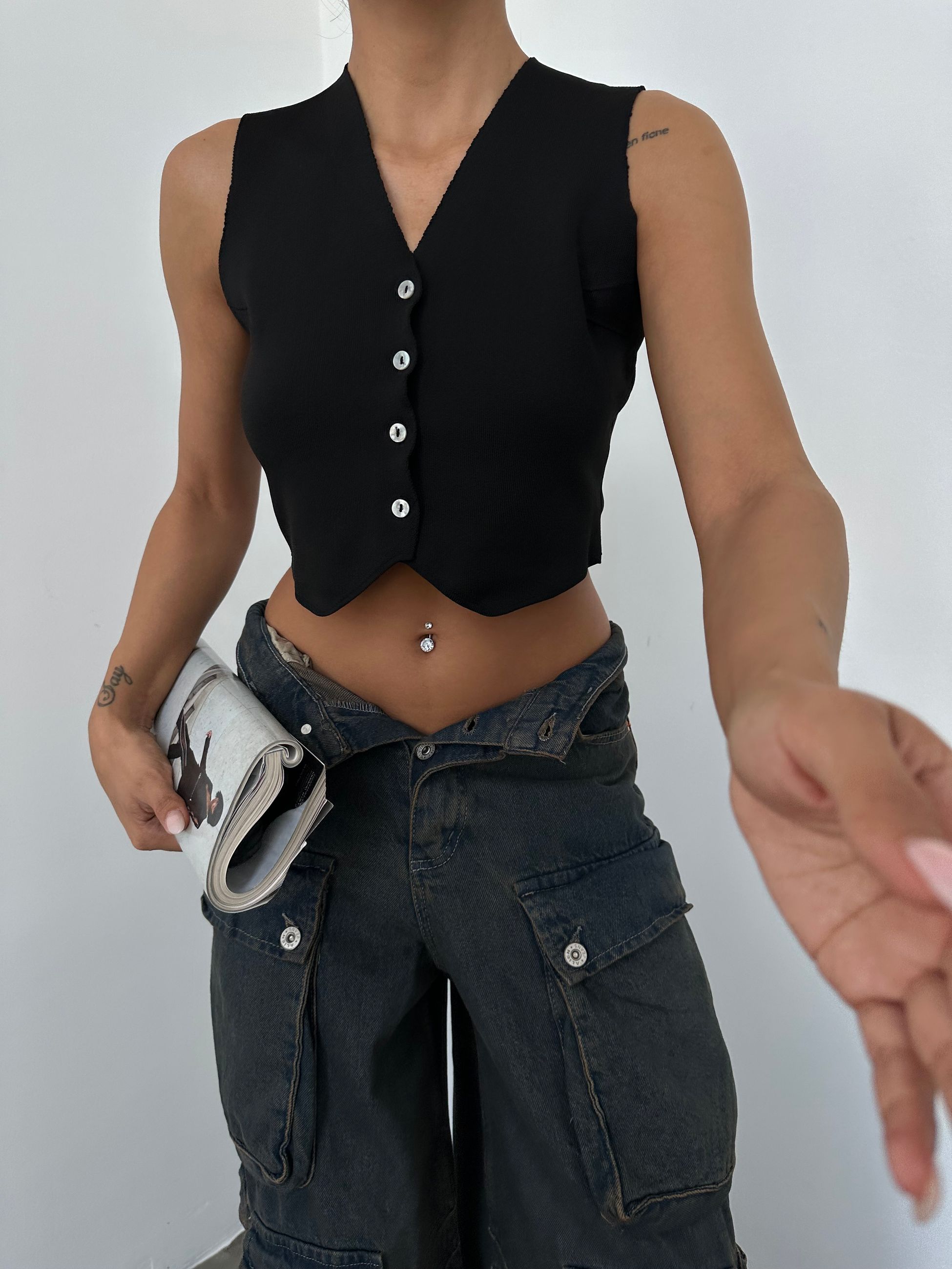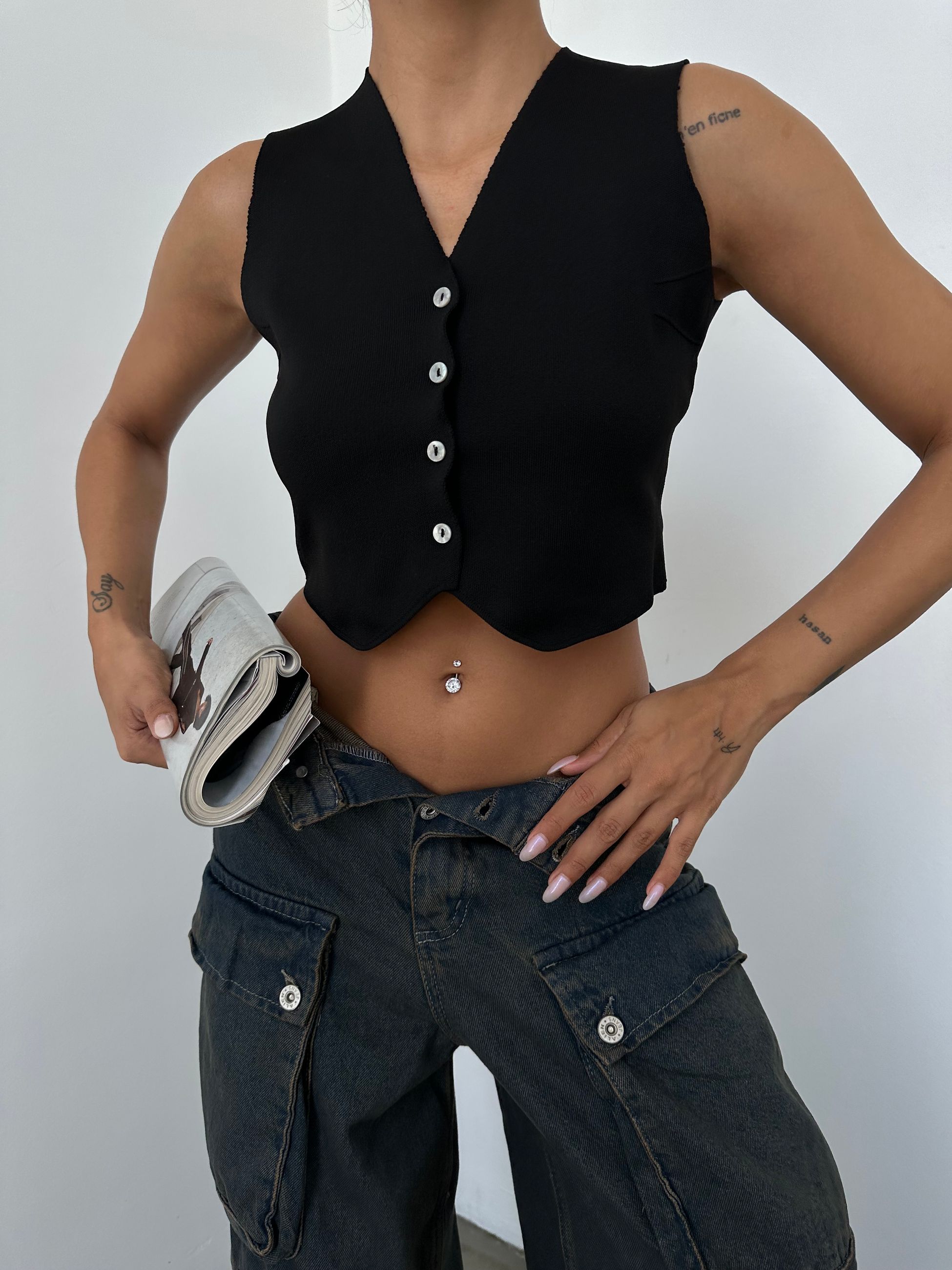 Klasik Düz Renk Crop Yelek Triko Bluz