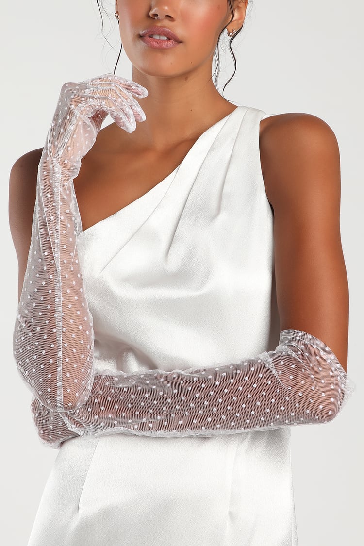 Uzun Boy Beyaz Puantiyeli Beyaz Renk Yetişkin Tül Eldiven